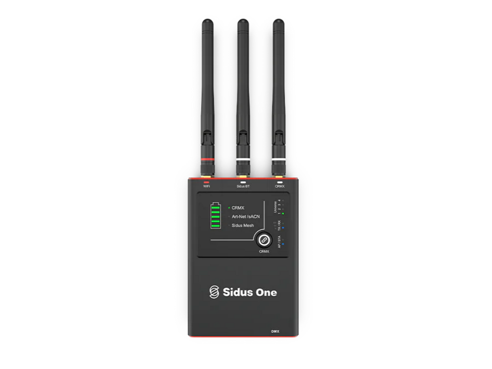 The Sidus One is a battery-powered transceiver that supports a single universe of DMX/CRMX control and is compatible with a variety of protocols including CRMX, DMX512, RDM, Art-Net, and sACN, all accessible via Wi-Fi or Sidus Link Bluetooth. It can be linked with up to three other Sidus One units to control up to four universes. The device boasts an 18-hour battery life, USB-C charging, and is IP54 rated for dust and water resistance.