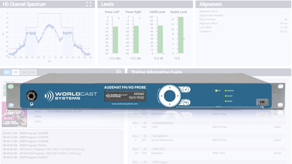 WorldCast Systems says the Audemat FM/HD Probe supervises FM and HD Radio services in one platform. The system monitors signal presence, audio levels, metadata integrity, and alignment between analog and digital paths.