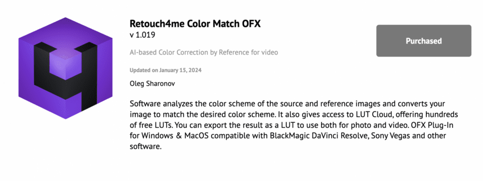 Color Match OFX analyzes the color schemes of both the source and reference images and adjusts the video to match the chosen colors. It also provides access to a large selection of free Look-Up Tables (LUTs) through LUT Cloud. Users can export these LUTs for use in both photos and videos.