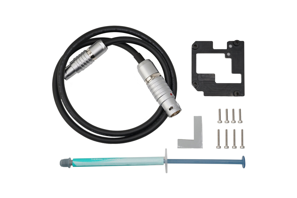The Version 2 upgrade kit includes several components: a red tilt stage cover, a circuit board, a spacer, thermal pads, thermal paste, screws (M2x10 and M2x14), and a flexible power cable compatible with the ARRI ALEXA 35. Installation is user-friendly, requiring only basic tools such as a Phillips screwdriver, a T6x50 Torx key, a 1.5mm Allen wrench key, a heat gun or hair dryer, and tweezers. No soldering is needed, offering flexibility to add or remove the upgrade as desired without permanent changes to the Ronin 2.