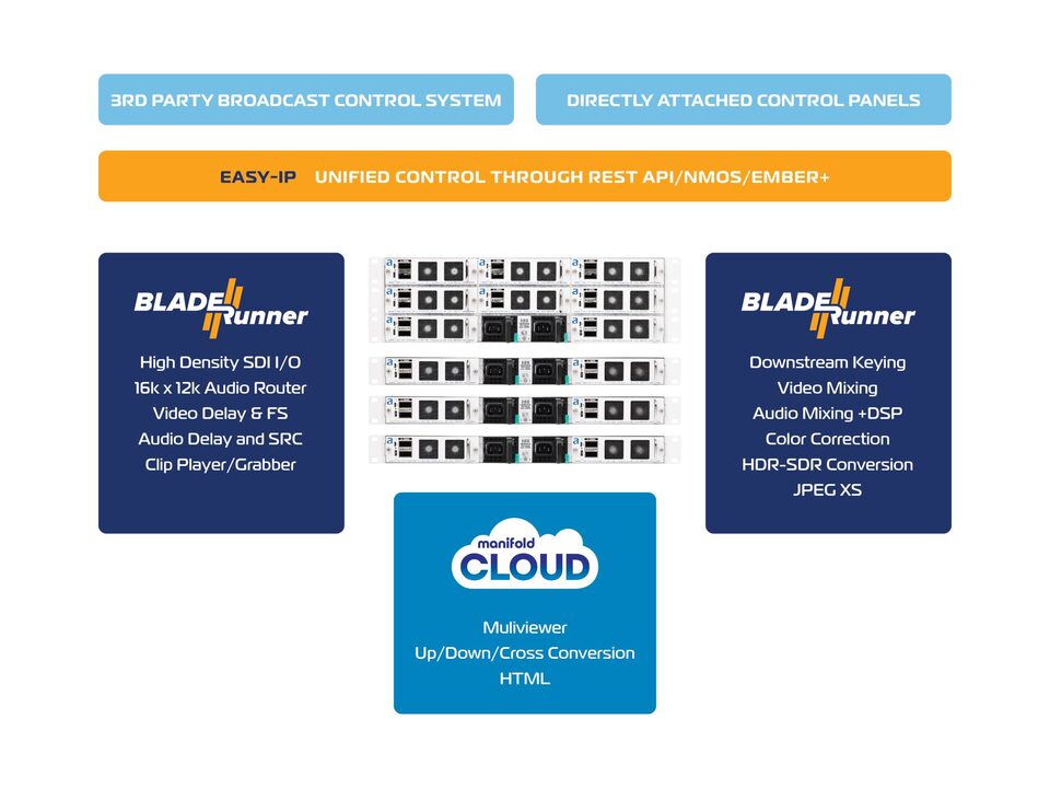 The EASY-IP package combines Arkona’s BLADE//runner with Manifold’s manifold CLOUD. This integration provides best-of-breed audio/video routing, processing, and multi-viewing tools in a single cohesive platform. The solution is designed to easily integrate into existing broadcast facilities using industry-standard control protocols, facilitating a seamless transition to a flexible and future-proof IP infrastructure.