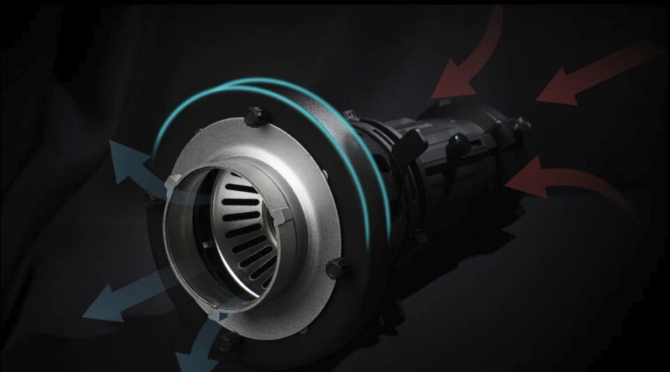 Addressing safety concerns, the projector’s design incorporates an elevated shell to reduce accidental contact. Additionally, a heat dissipation shield is integrated to manage the heat generated, especially when operating with 300W-600W lighting fixtures. This design minimizes the risk of excessive temperatures and potential burns, ensuring a safer user experience.
