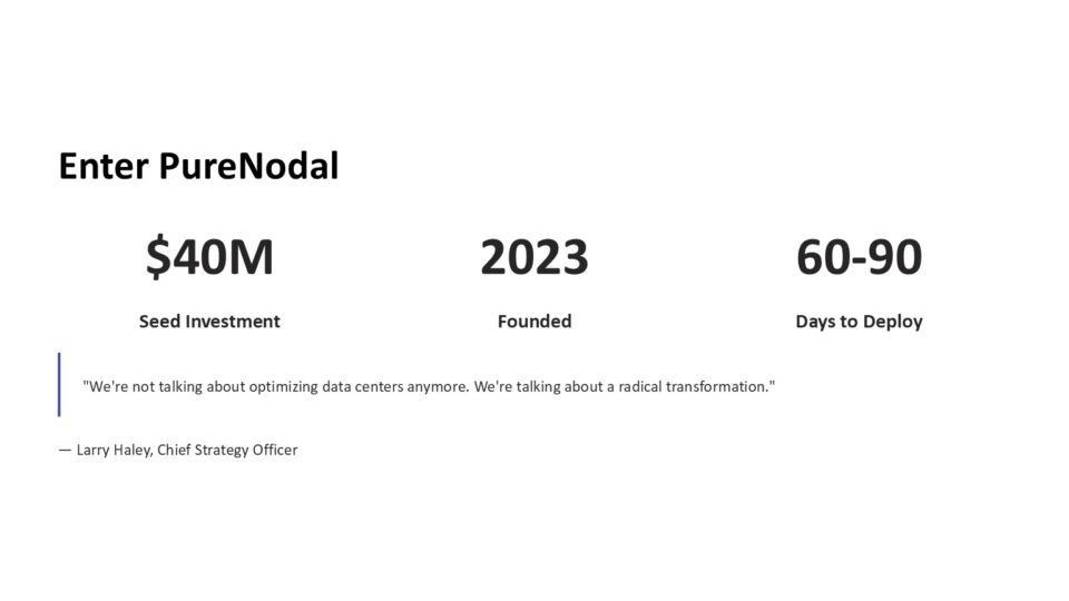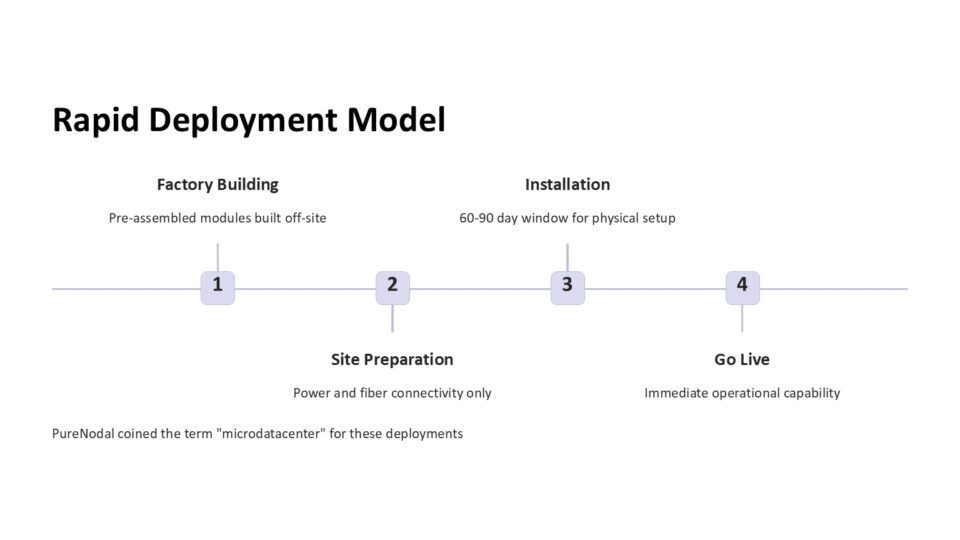 The 60–90 day installation window is only for physical installation and in-site commissioning of pre-fabricated modules. The game-changing part of this is that you can now take a data center to the power instead of waiting for all of the long lead-time infrastructure build-out to reach a typical large-scale project. PureNodal has coined the phrase microdatacenter for their deployments.