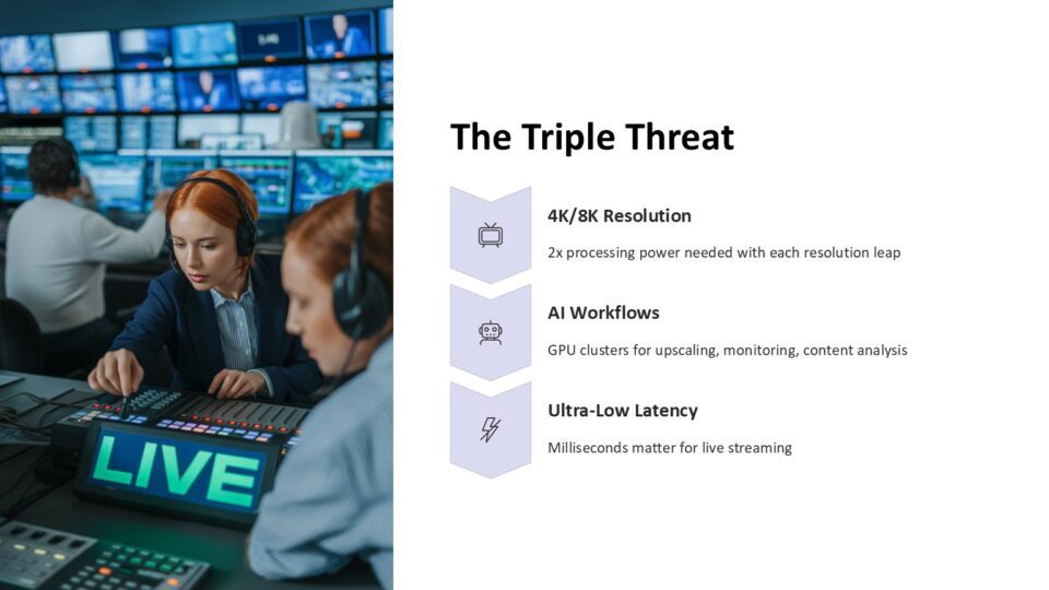 With every resolution leap—4K, and now 8K—takes twice the amount of processing power to encode, transcode, and play out. AI-driven upscaling, machine learning-based quality monitoring, and advanced content analysis all require densely packed GPU clusters burning their candles at both ends. And simultaneously, low-latency sports streaming, news, and interactive applications don’t allow for delay—latency must be measured in milliseconds, not seconds.