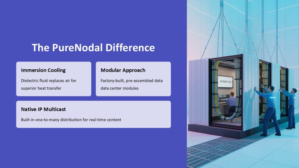 PureNodal’s approach brings together immersion cooling inside factory-built, pre-assembled blocks of modular data center modules that can be installed and go live in 60–90 days, once the site has power and fiber connectivity. Factory-based methodology bypasses the most time-consuming phases of traditional building and allows broadcasters and service providers to keep pace with market opportunities for capacity growth.