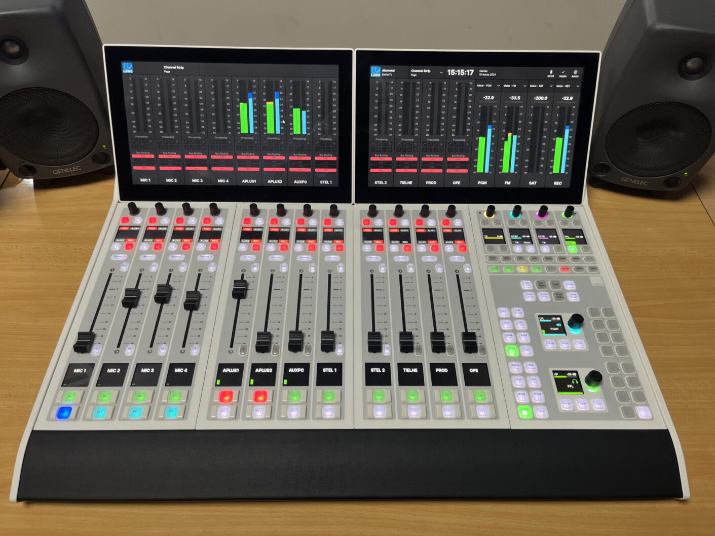 The recent installation includes Lawo’s 12-fader diamond console and the VisTool virtual extension. This modular broadcast console, designed for both radio and TV applications, is built on the open AES67/RAVENNA Audio-over-IP networking standards. This ensures seamless connectivity and compatibility with industry standards such as ST2110-30/-31 and ST2022-7.