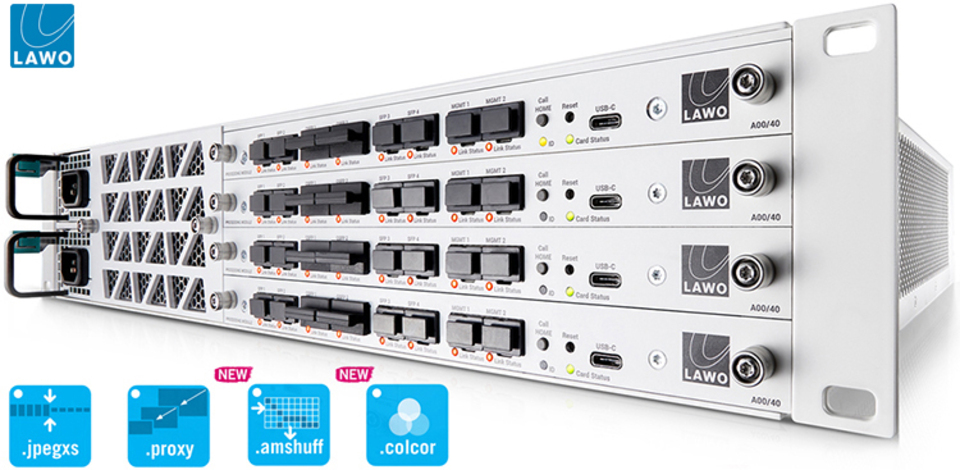 Lawo says the HOME Apps portfolio also includes UDX conversion with HDR processing, graphics insertion, stream transcoding, color correction, timecode generation, test patterns, tone generation, and audio DSP tools.