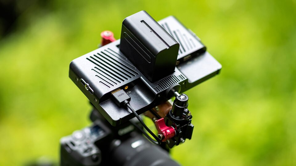 The back of the monitor houses a built-in Sony NP-F-style battery plate. With its low power consumption of 10W, a Sony NP-F750 battery can power the monitor for up to 10 hours at full brightness. The built-in speaker allows for audio playback during footage review.