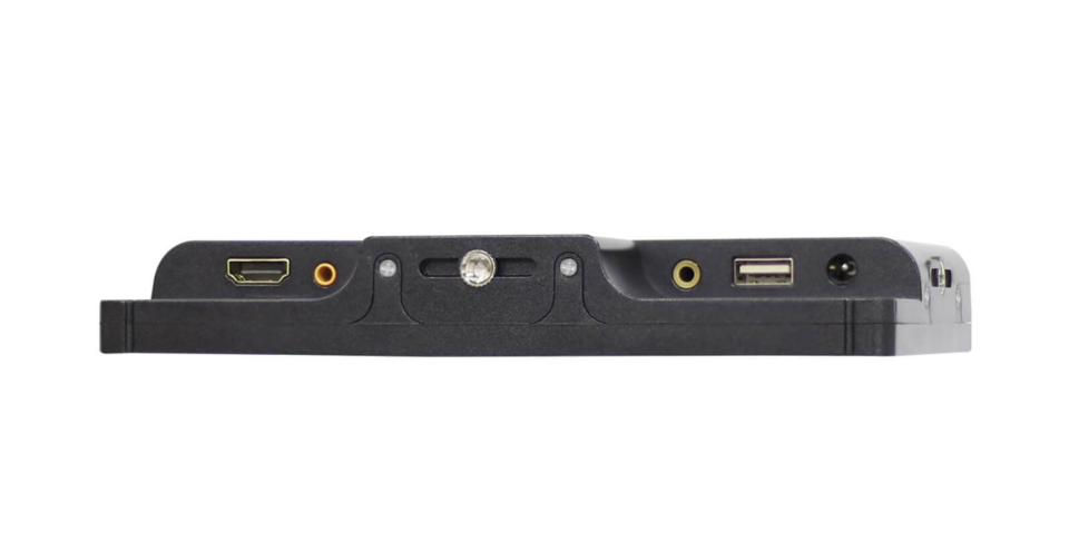At the bottom, it features a full-size HDMI input and an AV input port that doubles as a 3.5mm audio input. There is also a 3.5mm headphone jack, a USB Type-A port for firmware upgrades, and a DC 7-24V power input with a 5.5mm barrel connector.