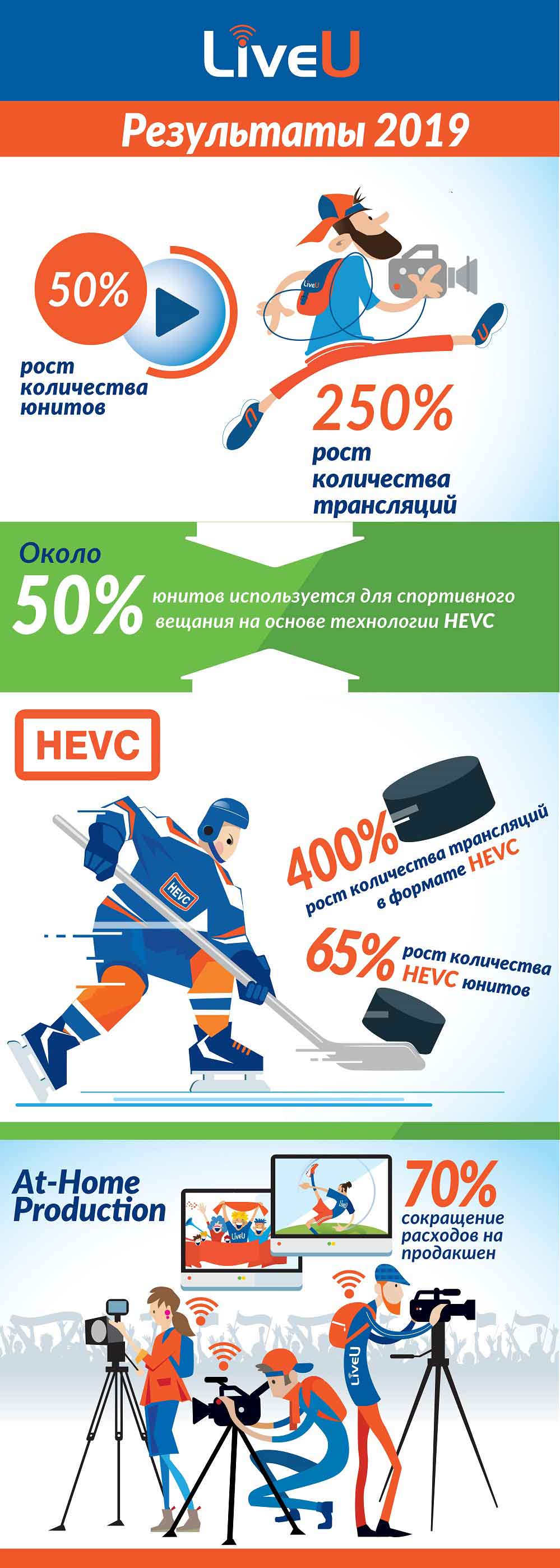 Формат кодирования видео HEVC продолжает играть важную роль при проведении прямых эфиров особенно для динамичных спортивных трансляций. Это связано с более высоким качеством видео и эффективностью использования пропускной способности сети. LiveU сообщает о 65% росте количества HEVC юнитов и более чем 400% росте количества трансляций в формате HEVC. Около 50% «полевых» юнитов используются для спортивного вещания на основе технологии HEVC, что составляет почти 80% трансляций в формате HD.