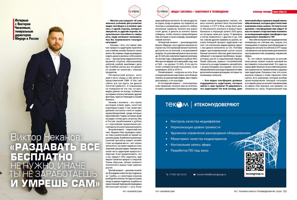 Интервью с Виктором  Чекановым, генеральным директором Megogo в России. Опубликовано в ТКТ 06 (722) 2020.