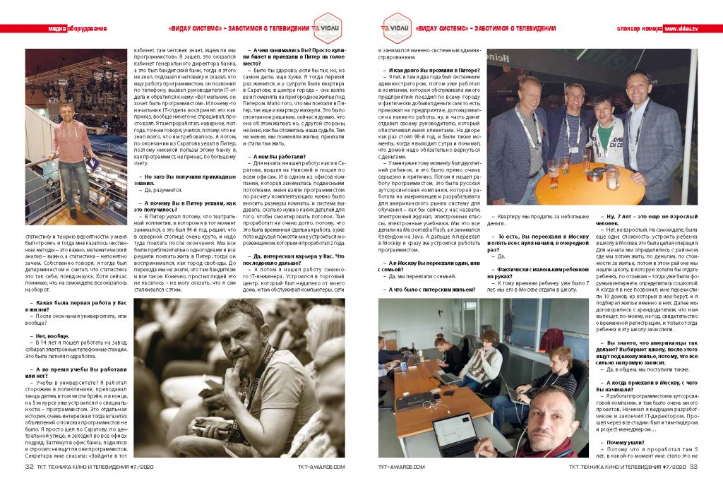 — Да, я всячески пытался найти работу и никак не мог, был не трудоустроен 3 месяца, такого до этого я никак себе представить не мог. Это был сентябрь-октябрь-ноябрь, и я просто стал уже отчаиваться. В конце концов, я написал в FB, что ищу работу, и на меня вышла знакомая, с которой мы вместе когда-то работали в hh, и которая в этот момент возглавляла техническую службу дирекции вещания Первого канала. И у нее была задача сделать новый сайт для Первого канала. Я под эту роль подходил. Через полгода после моего прихода мой непосредственный руководитель сказал: «Первый я покидаю, ты встанешь на мое место». Мы запустили сайт, не без сложностей, как всегда это бывает, когда выполняются такие большие проекты, но, в общем и в целом, перезапуск прошел удачно. В результате я проработал почти 5 лет техническим директором Дирекции интернет-вещания Первого канала. И начиная с этого момента, я работаю на телевидении.
