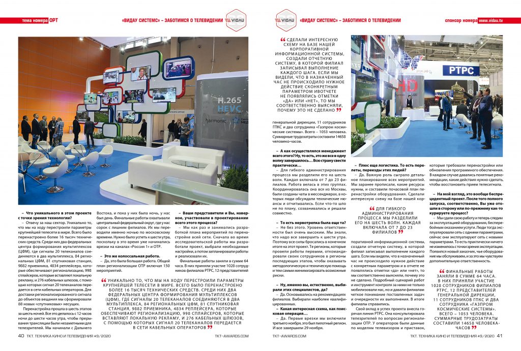 За это время ОТР создал каналы связи, договорился с вещателями, приобрел и установил оборудование. Нам же пришлось переконфигурировать всю сеть, менять параметры оборудования и переставлять все несущие на спутниках. Сначала мы думали, что сможем сделать это одномоментно, потом поняли, что правильней разделить огромный комплекс работ на несколько этапов. Мы объединяли наши филиалы в группы и постепенно переводили их на новый формат работы. В итоге мы реализовали проект вовремя, без задержек.