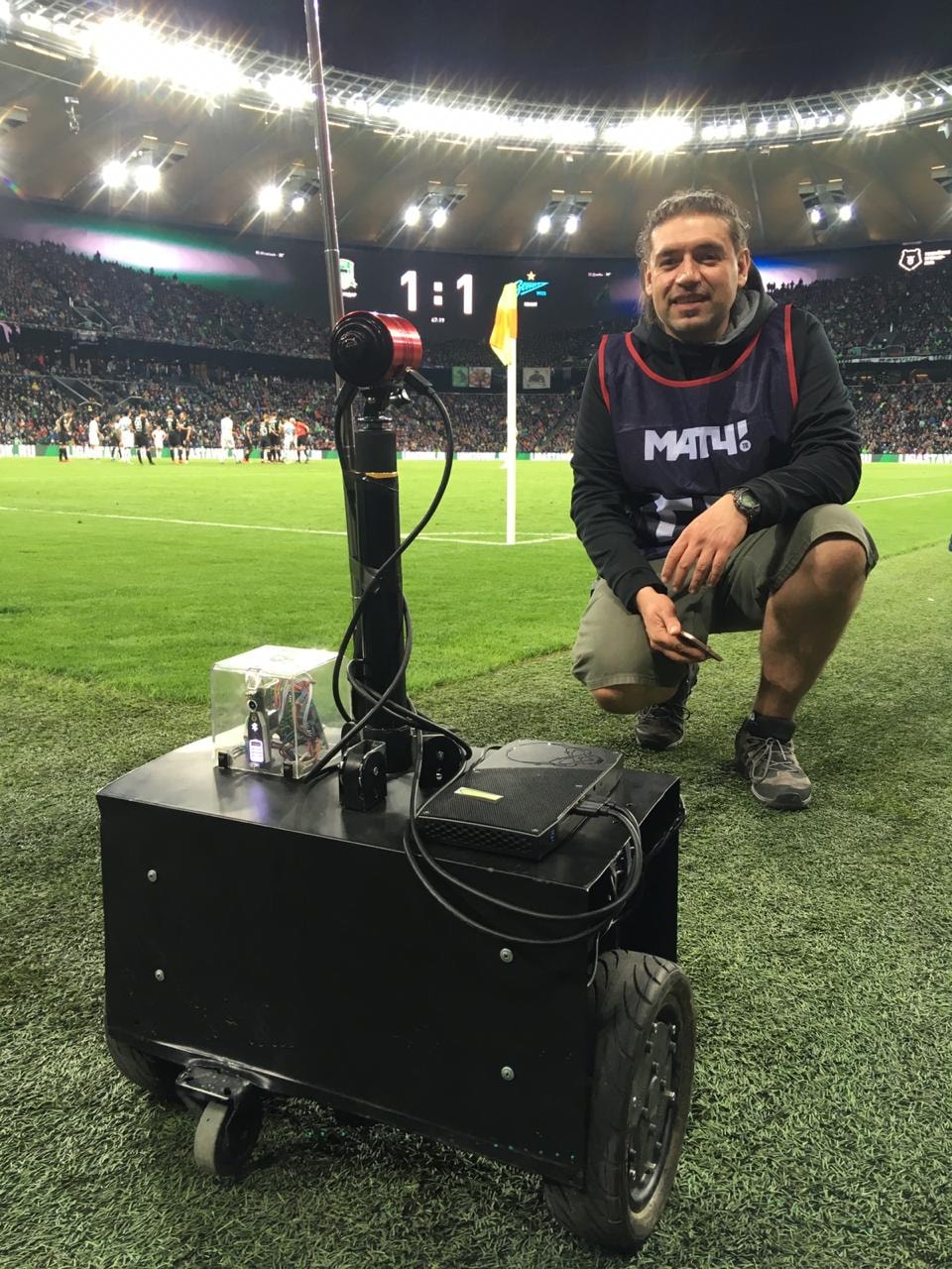 И мы не смогли выжать максимум из нашей роботизированной платформы, которую мы назвали «Митя» (от английского meet/meeting). Этот проект мы развивали с Алексеем Дмитриевым (Planet 360), Григорием Шабаловым и Евгением Валуйским (Smartbadge). К слову это он придумал имя нашему роботу, которого ждал успешный дебют.