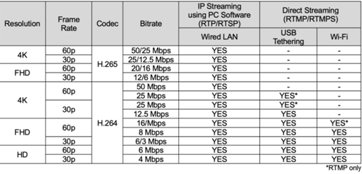 Доступные режимы трансляций с камеры Panasonic LUMIX GH5M2: