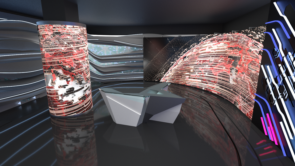 Внутрь декорации интегрирован огромный вогнутый светодиодный экран – центральная система выдачи видеоинформации. Ну и изюминка на торте – это наш цилиндрический экран. Для экранов мы разработали сложный, анимированный трёхмерный контент, который, по сути, тоже является продолжением декорации. Естественно, для каждой программы свой уникальный контент.