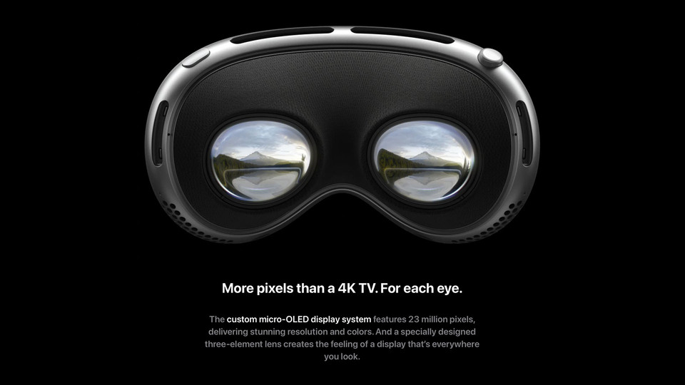 Apple Vision Pro с двумя 4K дисплеями, обеспечивающими общее разрешение в 23 миллиона пикселей, устанавливает новый стандарт для дисплеев виртуальной реальности.