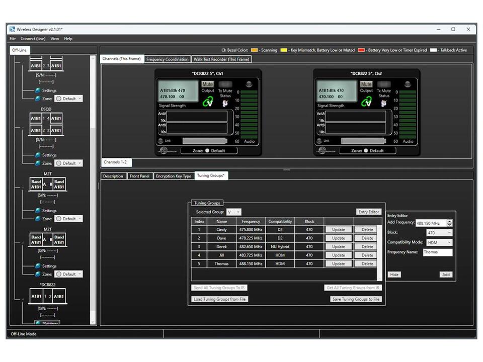 Недавние обновления портативных цифровых многоканальных Приёмник Lectrosonics DCR822, DSR и DSR4 теперь позволяют пользователям создавать, редактировать и делиться Tuning Groups с именованными записями. Программное обеспечение Wireless Designer V2.1 дает возможность создавать, импортировать, редактировать, сохранять и экспортировать эти Tuning Groups, значительно ускоряя рабочий процесс при добавлении и обновлении этих групп в экосистеме портативных приемников Lectrosonics.