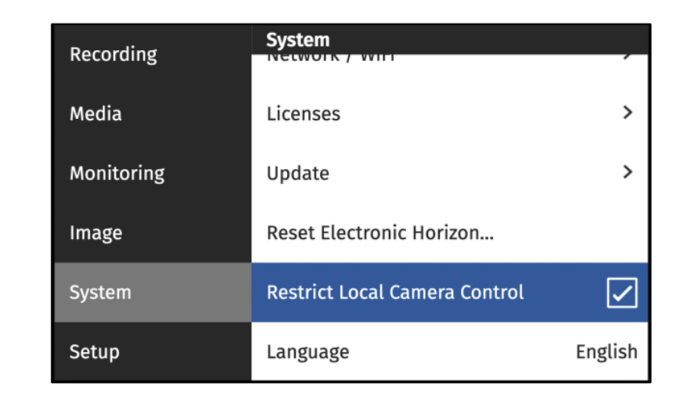 Этот параметр ограничивает доступ к настройкам камеры для оператора, позволяя ему изменять только настройки видоискателя, но не затрагивать основные параметры камеры. Ограничение не влияет на веб-интерфейс камеры.