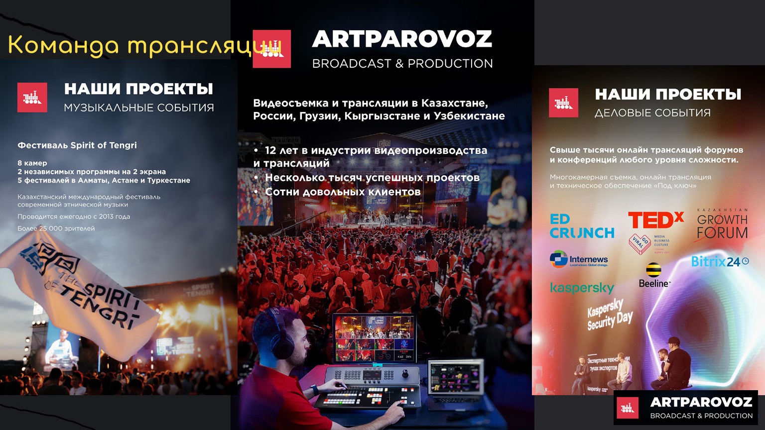 Мы делаем не только «обычные» прямые трансляции. Например, буквально три дня назад мы делали стрим из университета — Satbayev University, бывшего политеха, — на трёх языках одновременно. Кроме того, на нашей машине ПТС регулярно происходят выездные истории, в том числе многокамерные съёмки и спецпроекты.