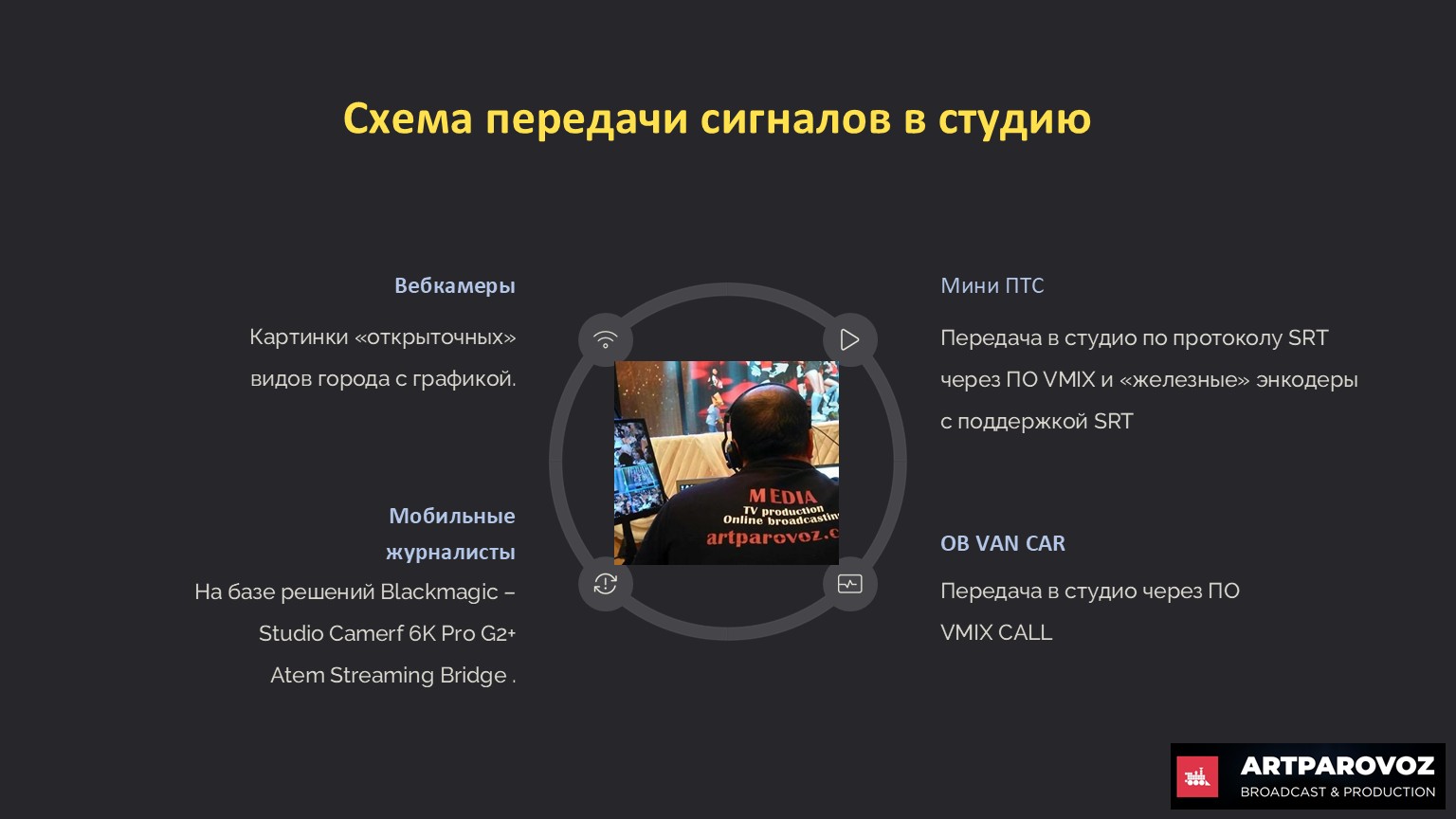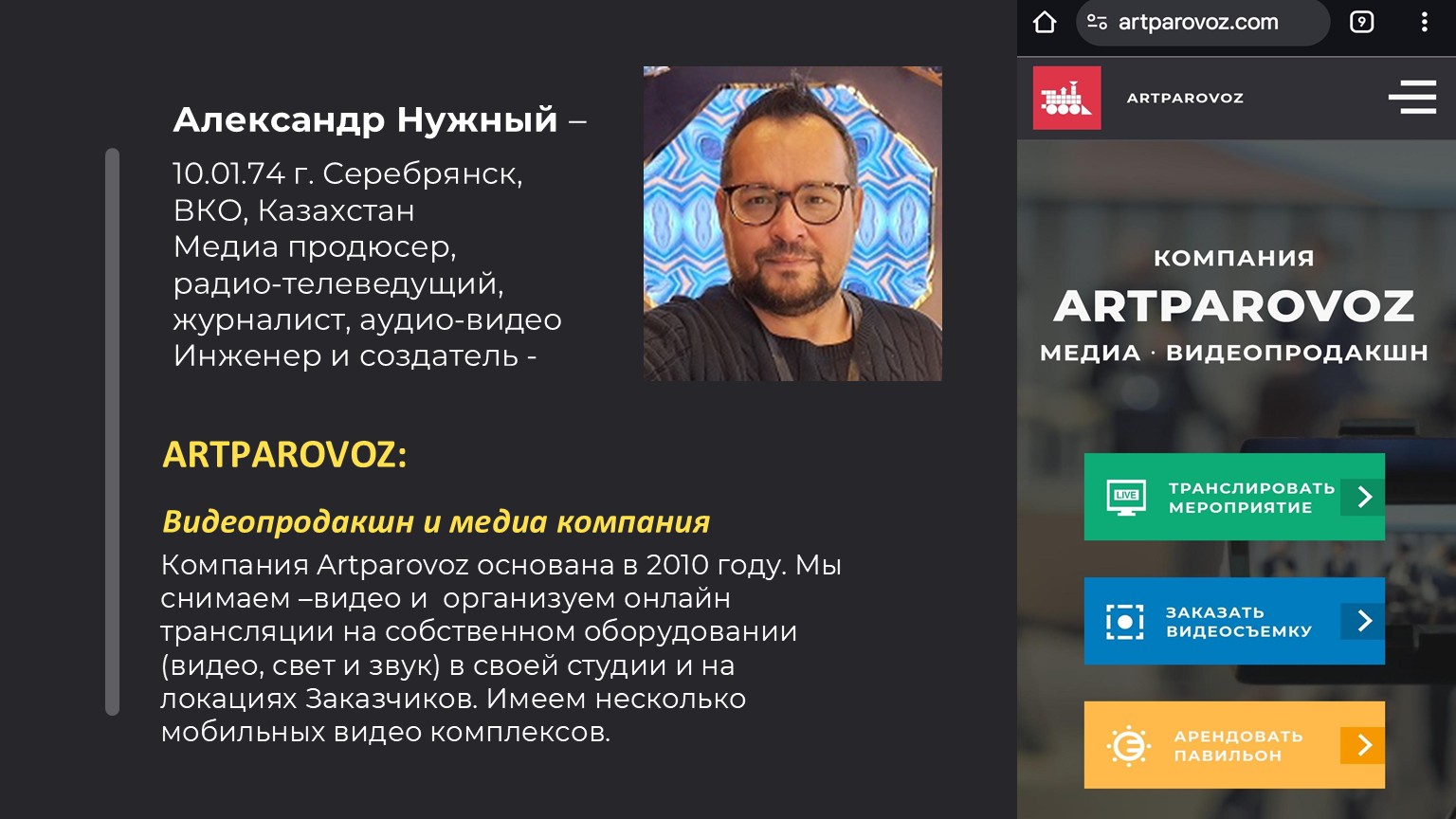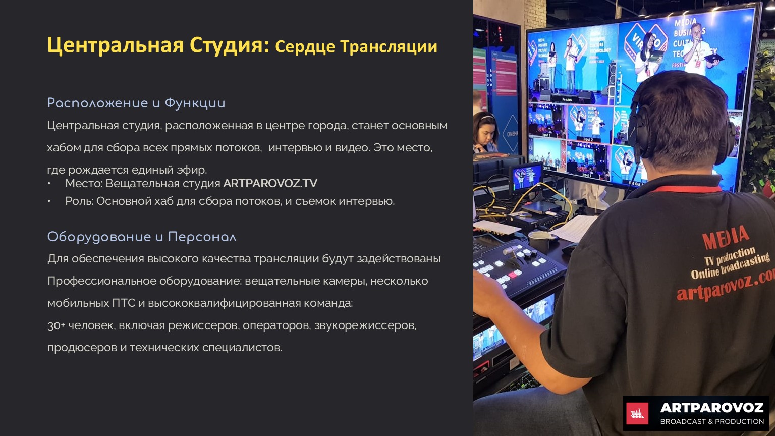 Интервью с Александром Нужным, основателем и владельцем компании Artparovoz, Казахстан, о чемоданных ПТС, Blackmagic, SRT, Starlink и практических схемах прямого эфира для малых продакшенов и фестивалей.
