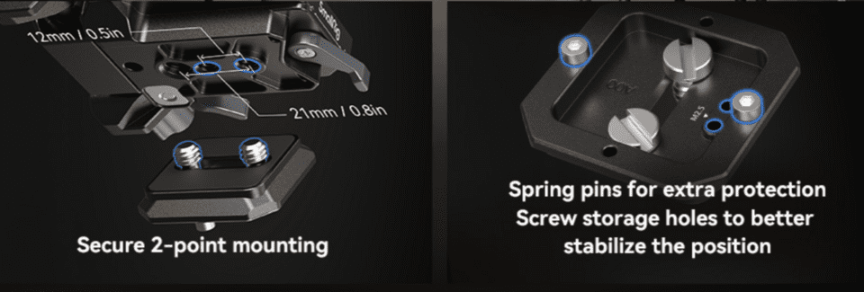 To further enhance its utility, the plate includes built-in 1/4″-20 threaded holes, allowing for additional power supply options by attaching SmallRig’s Mounting Clamp for Portable Power Banks. Moreover, the inclusion of both 1/4″-20 and 3/8″-16 holes at the bottom of the plate supports the attachment of other quick-release plates, increasing its adaptability and ease of use in various shooting scenarios.