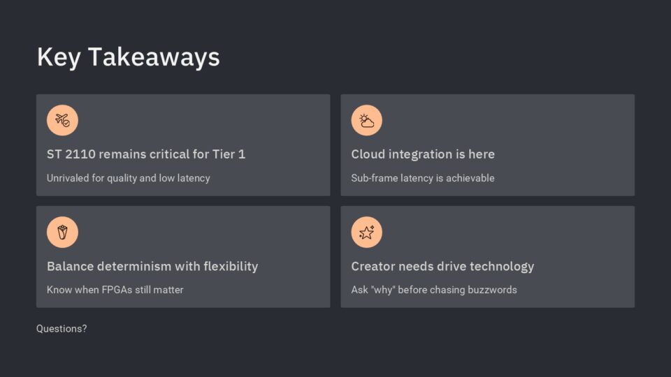 I have yet to hear of a tier 1 production, program, or broadcast channel relying upon a lower quality format. And yes, higher compression means lower quality, no matter what marketing language they use. No client involved with a tier 1 production has asked for anything less than ST 2110 since at least 2019. Which brings our heads into the clouds…