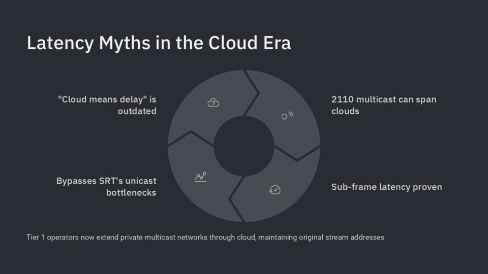 SMPTE ST 2110 multicast has been successfully extended, from ground to cloud and back, in multiple systems since 2024. This has been demonstrated with sub-frame latency over public Internet connections. If this is news to you, you SHOULD ask your friends ‘why?’