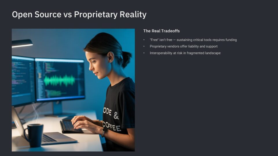 While the idea of open-source technical solutions sounds good at a glance, it only works if you can motivate smart people to make good contributions to the source. Because we do not live in a global socialist utopia, people must earn money to live. Really good work usually warrants bigger paychecks. Certain powers in media may have the capital to fund such work and even retain special architects… but it leaves smaller players unrepresented and provides opportunities for technological incompatibility between media sources (see NTSC vs PAL and extrapolate). It also removes the traditional liability and support structures much of the industry is built. Hard to point the finger at everyone… If all the significant portions of the source code are from your full-time staff, do you point the finger at yourself?