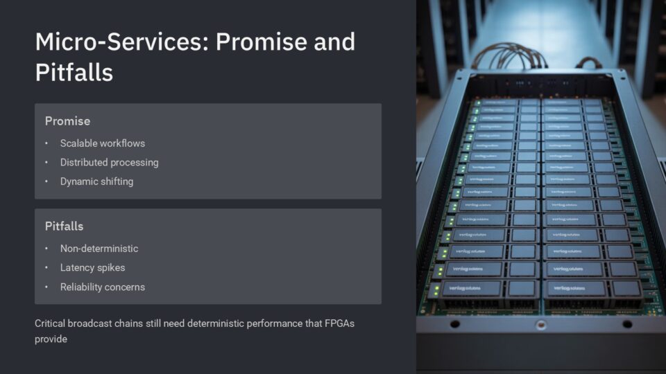 A stop in the workflow for encode/decode / conversion will always add latency and a point of failure- whether it occurs in an FPGA or a microservice in a server. While there are media giants who must deal with the acquisition and transmission of multiple video formats, it is always best to minimize variables or even settle on a single format for the core. One benefit of COTS architectures is that they do not force us to choose, and it is possible to divide your infrastructure into several networks dedicated to different media types. But this again requires planning and maintenance. We are many years away from a world in which a major international news hub can simply throw streams into a computer network and trust software to rapidly make the proper conversions.