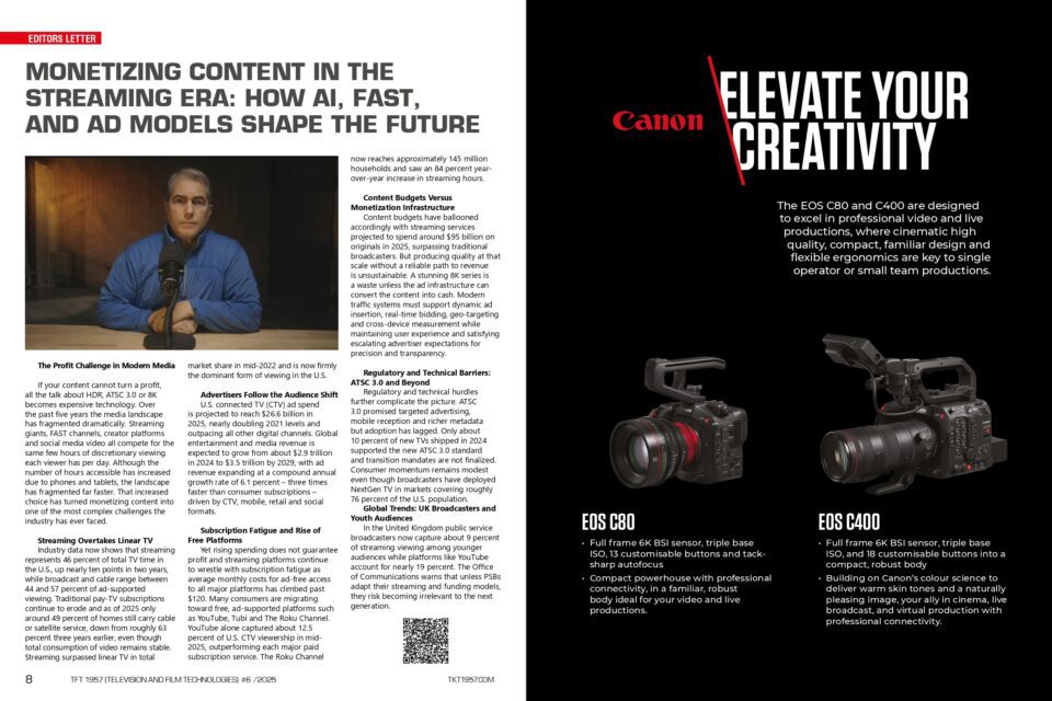 Analytics and forecasts from leading global experts, plus the surprising career turns of broadcast tech stars – all in the special issue of TFT 1957 | TV & Film Tech Magazine for IBC 2025.