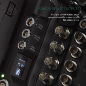 The kit also includes accessories that further expands the camera’s power options. Particularly, a V-mount or Gold Mount plate attaches to the back of the camera offering two 3-pin Fischer R/S ports (24V and 14.8V) as well as a 2-pin 14.8V power outlet.