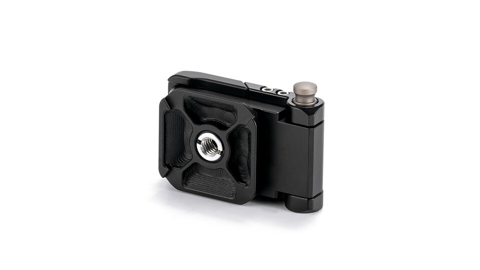 A 1/4″-20 screw located on the top of the baseplate facilitates attachment to the camera. A notable feature of the baseplate is a button on its side, enabling the user to rotate the top portion by 90 degrees for switching between orientations. It is important to note, however, that the baseplate does not offer intermediate positions between the 0 (horizontal) and 90° (vertical) angles.