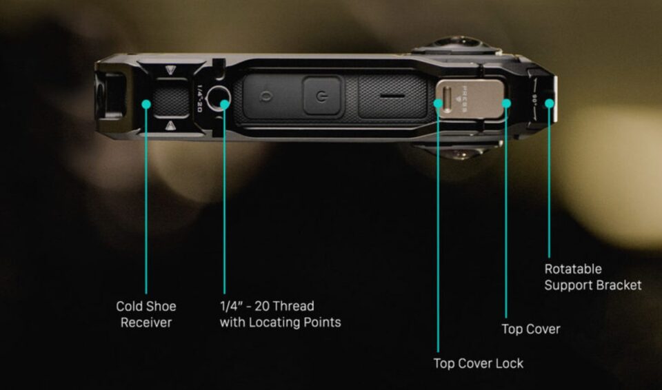 The Rotatable Support Bracket swivels 90°, enabling users to place the camera on flat surfaces without scratching the lens or the cage.