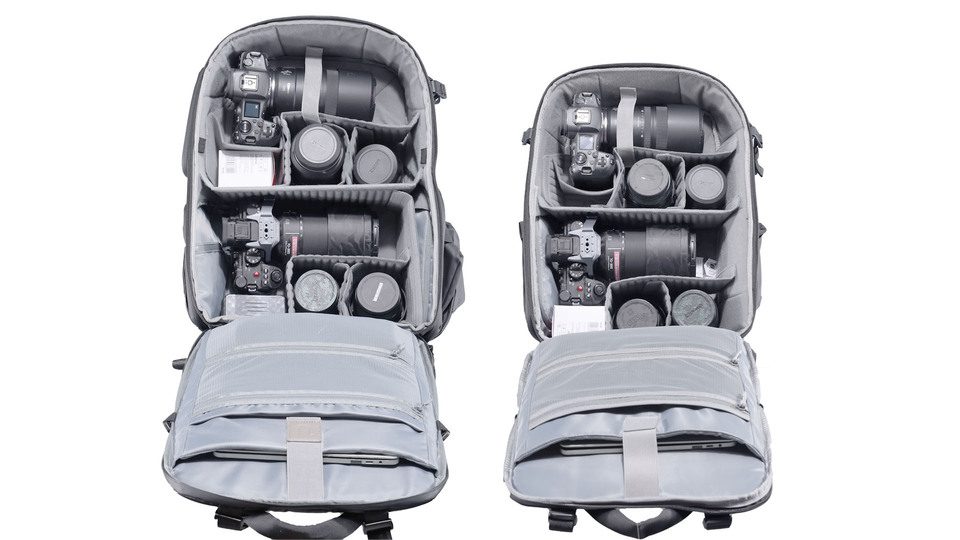 The BP09, the smaller model in this new lineup, is tailored for photography enthusiasts and travelers. With dimensions of 17.3 inches in height, 6.89 inches in width, and 13.38 inches in length, this 22-liter backpack is capable of holding two cameras, approximately four lenses, and various other accessories. It may not accommodate larger professional cameras with vertical grips, but it’s not intended for that demographic. The BP09 includes multiple dividers for customizable organization, a spacious compartment for a 16-inch laptop, and additional pockets for extra storage. It also features a large clamshell opening and a quick-access opening on the right side, making it convenient for everyday use.